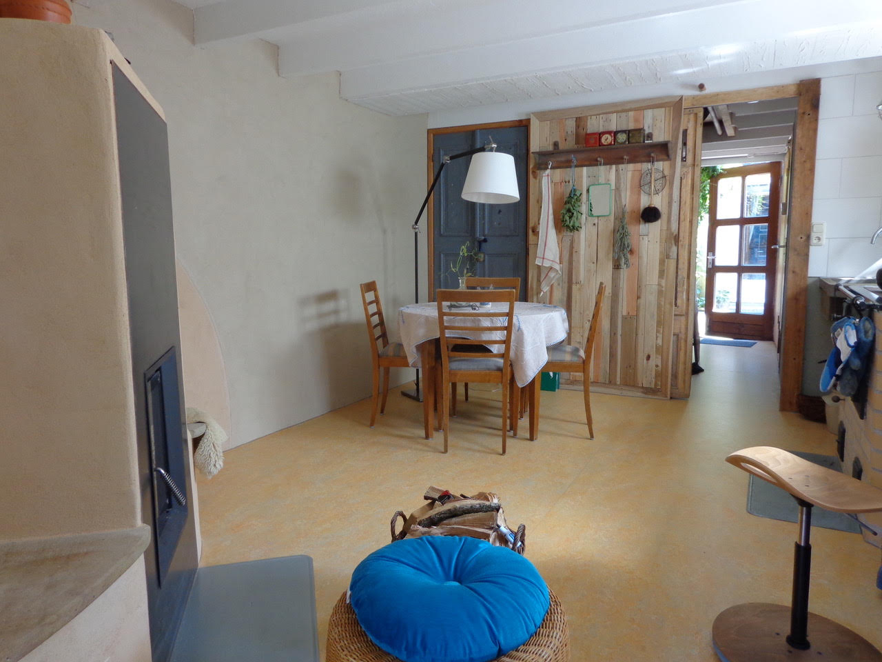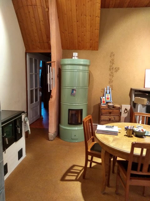 Koken en bakken doen we op en in een gemetseld stenen fornuis. Dit met hout gestookte fornuis heeft een grote bakoven voor brood, pizza en ovenschotels. Het verwarmen gebeurt met een hout gestookte cv-ketel die is geïntegreerd in een organische leemkachel met twee verwarmde zitbanken. Deze kachel verwarmt de woonruimte zelf en levert daarnaast tapwater en cv-water. Vloerverwarming en wandverwarming zijn op de ketel aangesloten, net als een radiator op de eerste verdieping.