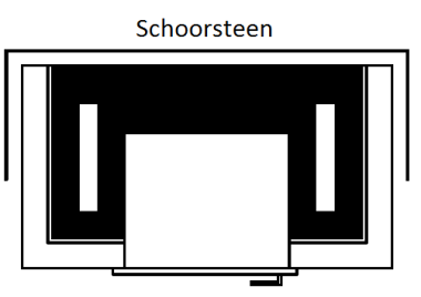 kachel met plaatstalen stookdeur en metselwerk aan drie zijden.