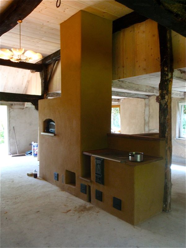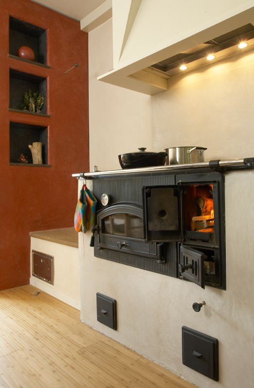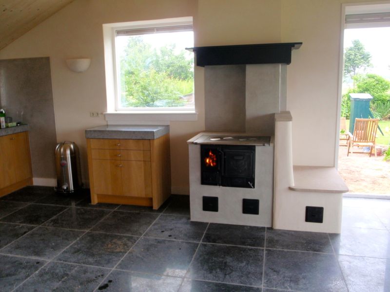 De rookgassen van het houtgestookte fornuis of bakoven hoeven niet direct via de schoorsteen afgevoerd te worden. Ze kunnen door een zitbank of muur worden