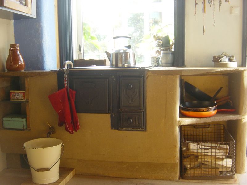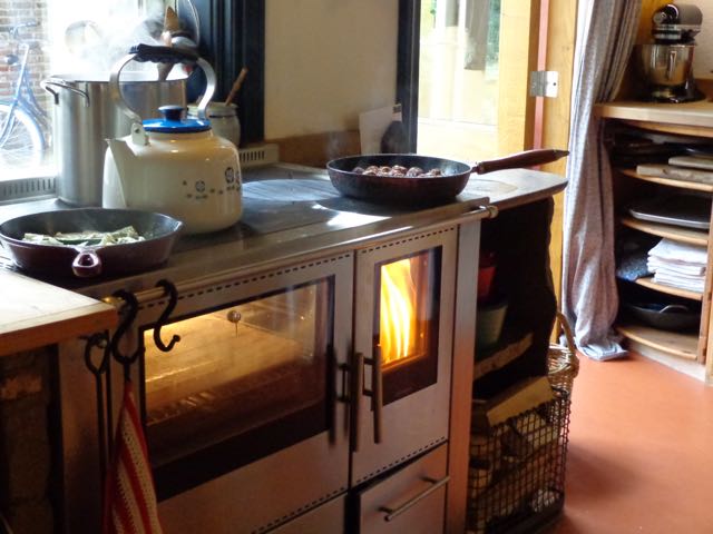 Het kooktoestel levert bovendien snel en veel directe energie, circa 8 KW, naar de keuken en de kookplaat zelf. Wij frituren, grillen, koken, bakken, braden en stoven er dagelijks moeiteloos op. De naast de fornuisdeur gelegen, ruime bakoven warmt op door optimaal contact met de erlangs stromende rookgassen. De glazen bakovendeur is voorzien van een handige thermometer. We bakken er brood, pizza, ovenschotels en zoete fruittoetjes in. De na het stoken aanwezige restwarmte gebruiken we voor het op temperatuur houden van gerechten, het ontdooien en het drogen van bijvoorbeeld tomaten en kruiden. Wij hebben op een van de twee roosters in de bakoven een zware chamotteplaat gelegd die de warmte lang vasthoudt. Lees hier meer over onze pizzastenen/ broodbakstenen. De houtas die ontstaat bij het verbranden van het hout wordt opgevangen in een aslade die onder de stookdeur is geplaatst, deze houtas is composteerbaar.