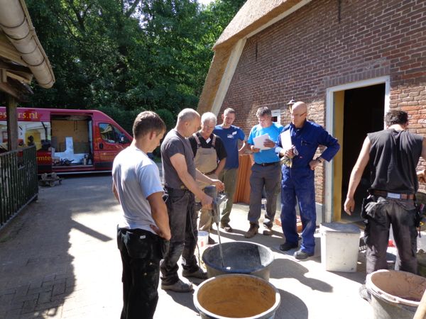 Ook dinsdag 18 juni gingen we na het ontbijt snel aan het werk. Iedereen was de hele dag bezig met meten, metselen en mortels mengen. Na het avondeten, dat we door het mooie weer in de tuin konden nuttigen, werden eigen kachelplannen in de groep besproken en toegelicht. Woensdag 19 juni was er naast het kachelbouwen en het gebruikelijke vragenuurtje een rondleiding bij 't Natuurlijk Huus in Raalte. Op die locatie organiseerde Vuurmeesters in 2009 een kachelbouw workshop. Het was leuk te zien hoe mooi alles geworden is.