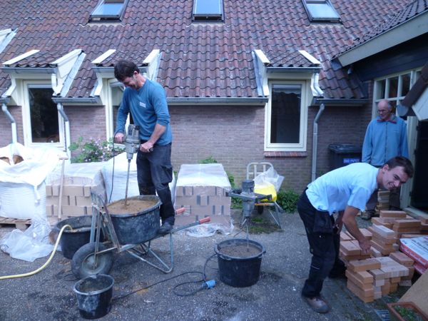 Het programma op maandag 3 september begon met een kennismakingsrondje en een korte inleiding door Heikki Hyytiäinen over de door hem ontwikkelde fire-box. Daarna werden stenen en mortels naar binnen gedragen en kon de eerste steen al snel gelegd worden. Pauzes voor koffie/thee, lunch en avondeten konden we door het mooie nazomerweer in de boomgaard doorbrengen.