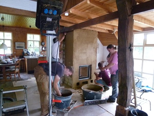 Dinsdag 4 september bouwden deelnemers laag na laag van de drie kachels op. Joppe van der Rijst vertelde over zijn eigen leemkachel waarin een warmtewisselaar van Toby Hafner is ingebouwd. Uit de groep deelnemers kwamen suggesties met betrekking tot andere soorten warmtewisselaars, zoals het zwaartekracht- systeem. Een interessante discussie volgde.